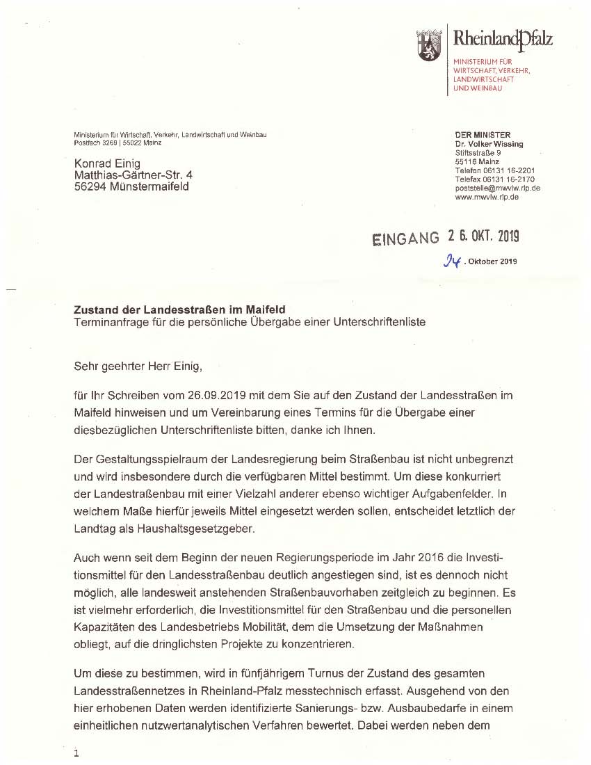 Der Appell der Unterschriftenaktion richtete sich an den zuständigen Minister in Mainz, an Herrn Dr. Wissing. 1.552 Bürger folgten der Aktion und forderten Herrn Dr. Wissing mit ihrer Unterschrift und ihren Kommentaren auf, Klarheit zu schaffen wann mit der Verbesserung der Straßen gerechnet werden kann. Nun liegt das Anwortschreiben von Herrn Dr. Wissing vor.