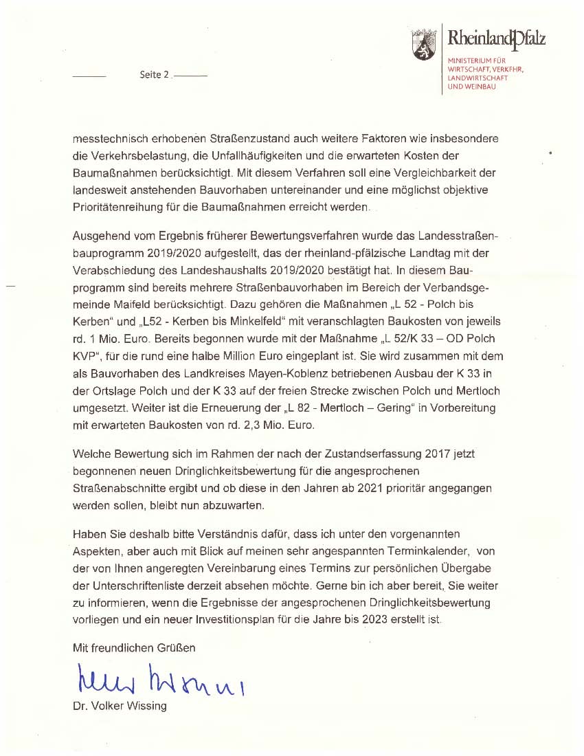Bedauerlicherweise ist Herr Minister Dr. Wissing unserer Einladung, sich ein Bild vor Ort zu machen nicht gefolgt. Zudem ist es Herrn Dr. Wissing aus Gründen seines engen Terminkalenders bisher leider nicht möglich, dass wir ihm persönlich die 37-seitige Liste mit den 1.552 Unterschriften und die 22 Seiten der schriftlichen Kommentare der unzufriedenen Bürger übergeben. Das bedauern wir sehr. Wir bemühen uns weiterhin darum, weiteres Gehör zu finden. An dieser Stelle bedanken wir uns bei allen, die aktiv Unterschriften gesammelt hatten, die unterschrieben und die sich mit ihren Kommentaren eingebracht haben. Das Schreiben von Herrn Dr. Wissing haben wir den Bürgermeisterinnen und Bürgermeistern der VG-Maifeld in Kopie zukommen lassen.